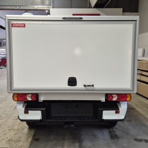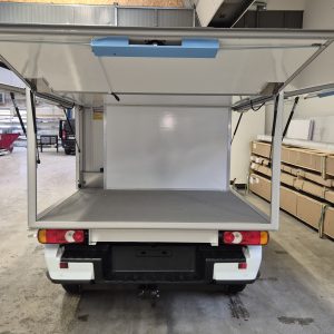Skåpet är försett med en eller flera luckor som fälls uppåt vilket gör att personalen kan stå regnskyddad vid materialhantering. Lådan med dess raka sidor gör att lastvolymen kan utnyttjas